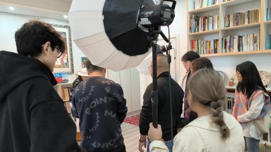 在访谈前,我中心成员与企业导师提前就拍摄框架、细节进行了多次协调协商,包括机位的选择、灯光的布置、场景的搭建等,以保证拍摄过程能够顺利进行。访谈中,红尘教授对自己在喜马拉雅徒步的过程侃侃而谈,也向广大读者介绍自己创作《珠峰鼓手》的初衷。访谈拍摄结束后,我中心成员与企业导师就本次采访拍摄过程中遇到的状况和出现的问题进行了分析总结,并积极商讨优化方案。