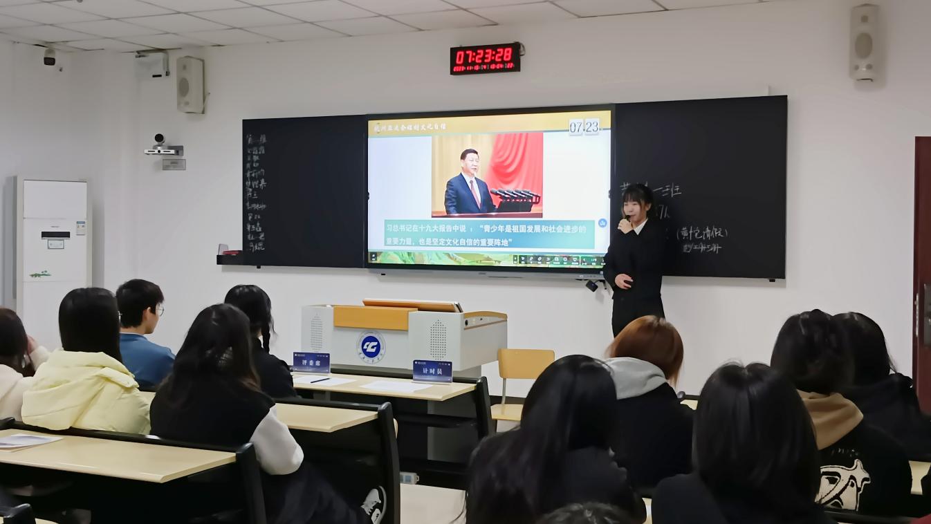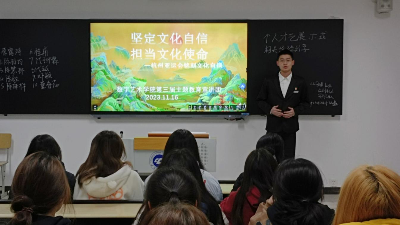 本期宣讲内容以“坚定文化自信,担当文化使命”为主题,围绕杭州亚运会,宣扬文化的重要性。文化是一个国家、一个民族的灵魂,关乎着国家的命运。通过举亚运会开幕式《千里江山图》《富春山居图》《携手同行》的例子,让同学们见证了古往今来中华文化迸发的蓬勃生机。最后,宣讲团引用习近平总书记对青年人的寄语鼓励大家将文化自信付诸实际行动,为中华文化的传承与发展贡献自己的一份力量。