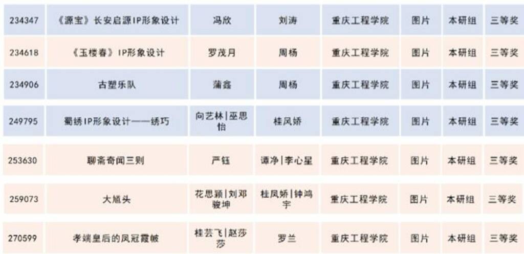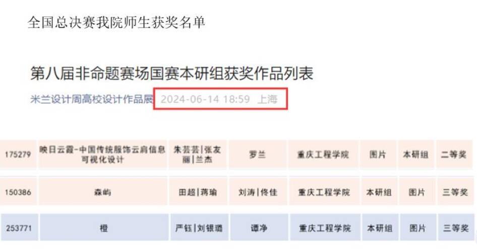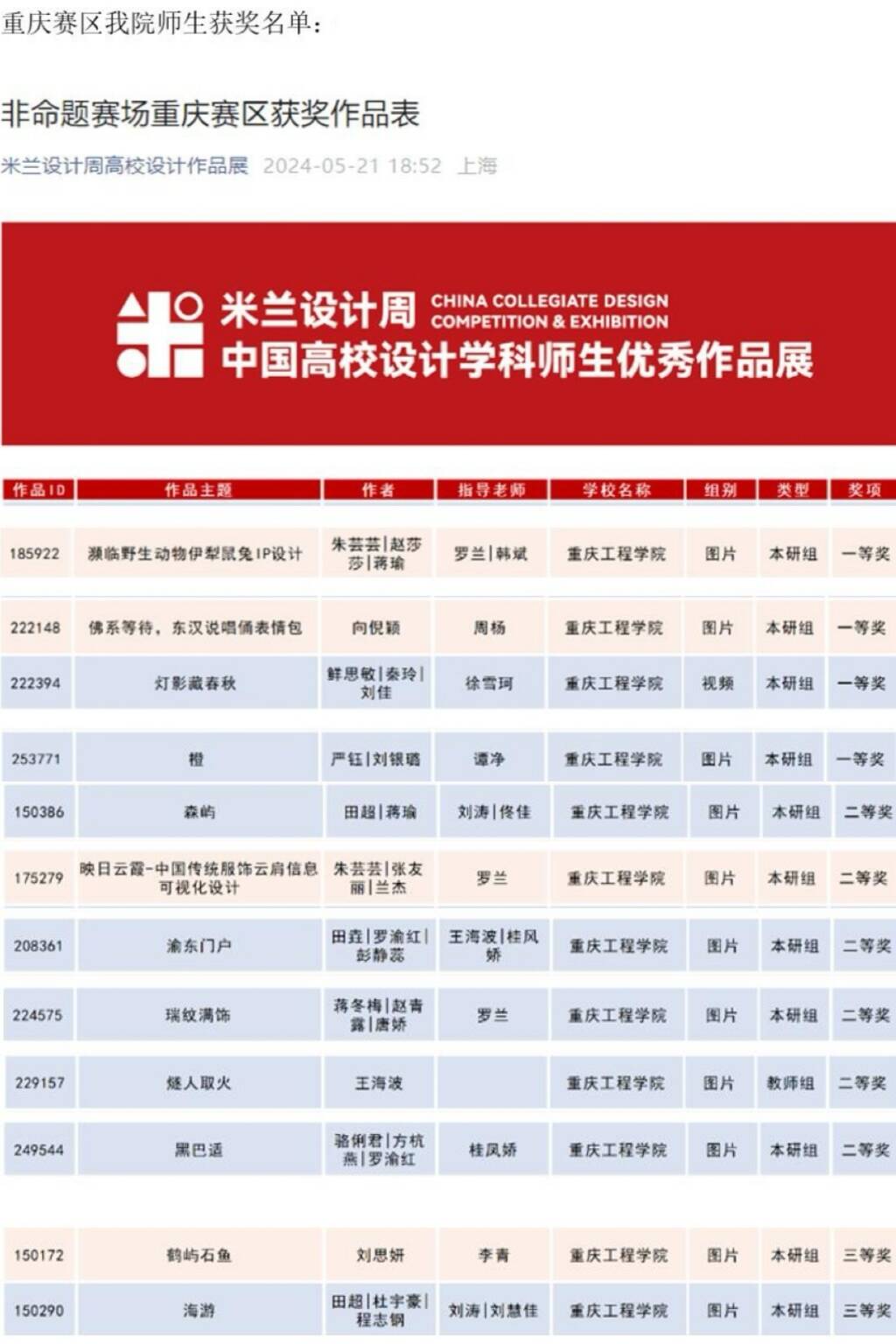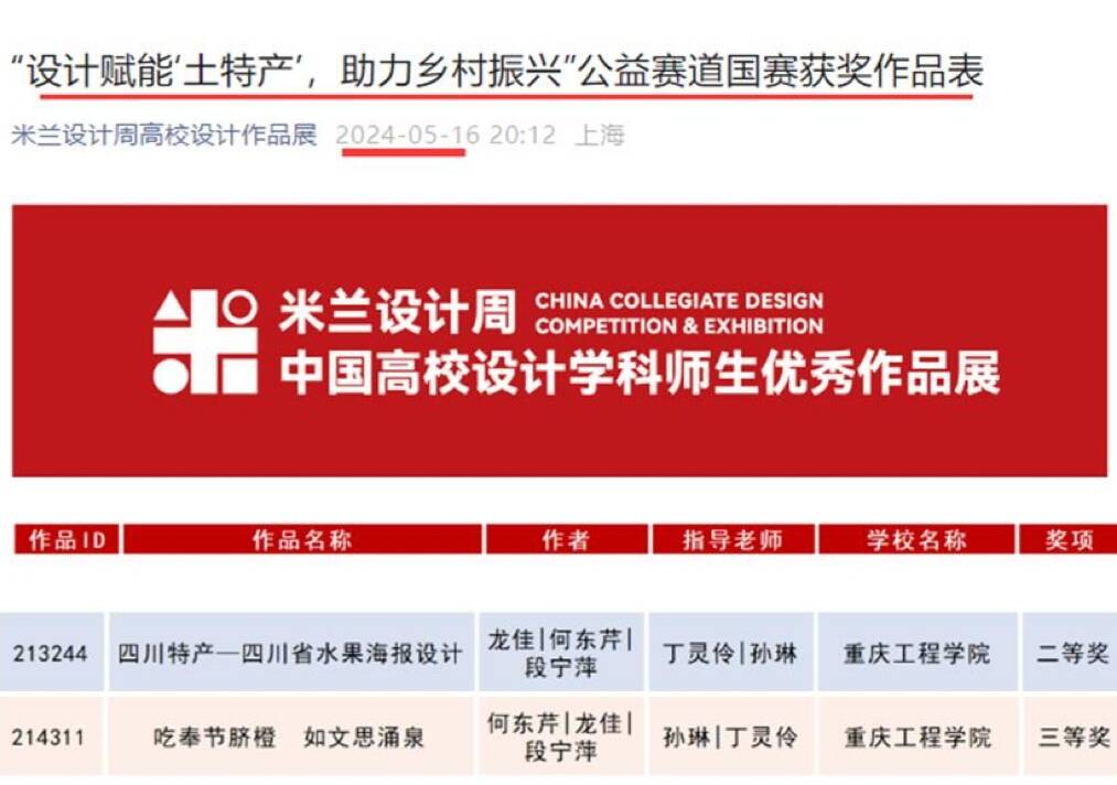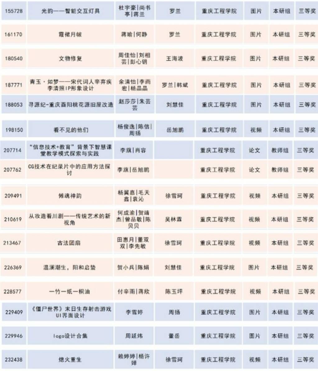 我院师生已连续参加该项大赛多届,获奖成果丰硕。在本届大赛中,我院师生再佳绩:获全国总决赛奖项5项,其中学生组二等奖2项,三等奖3项;重庆赛区奖项36项,其中学生组一等奖4项,二等奖5项,三等奖24项,教师组二等奖1项,三等奖2项。近年来,我院积极推进学科专业一体化建设,探索文化传承创新与专业融合特色发展之路,以赛促学,以赛促教,致力提升学生的设计创新实践能力和专业人才培养质量。