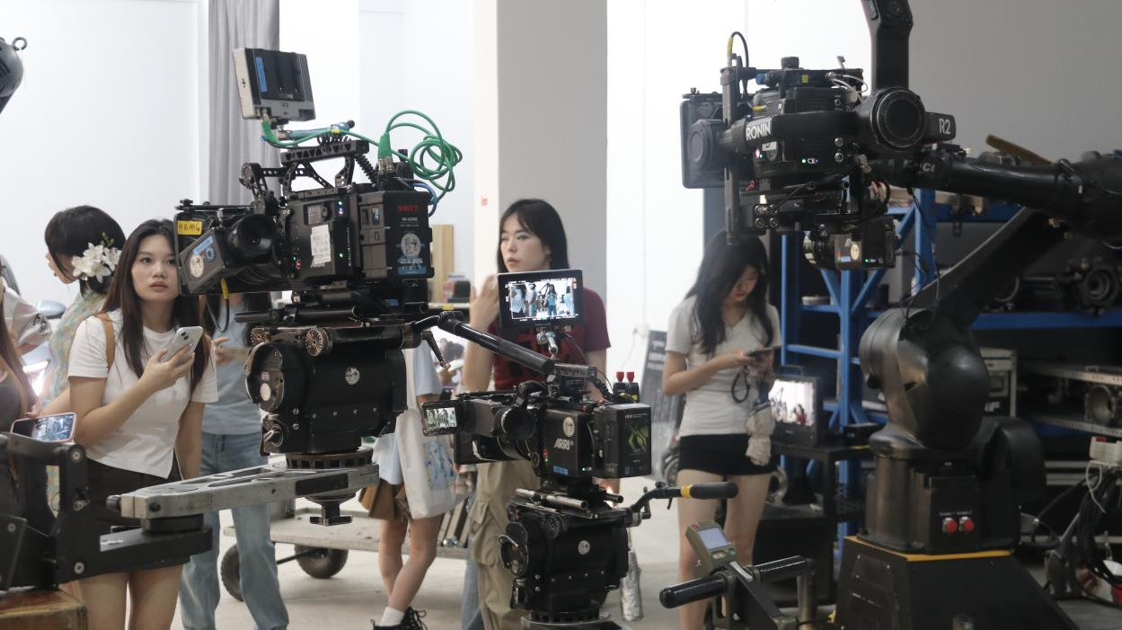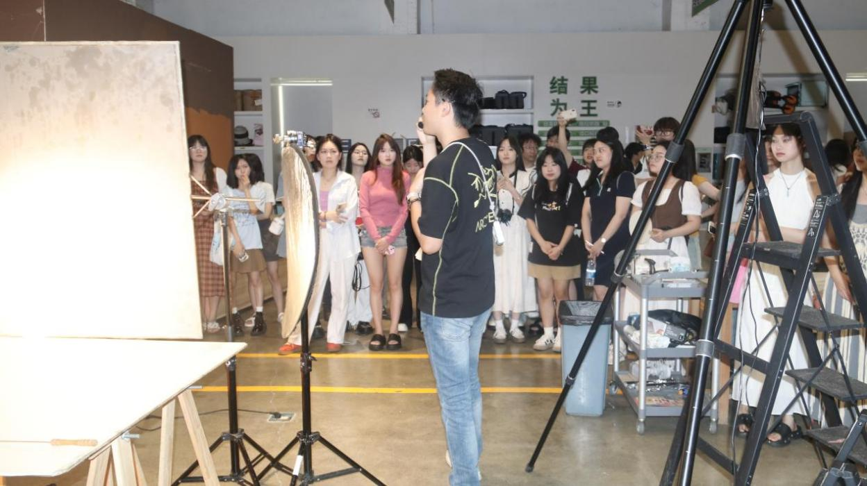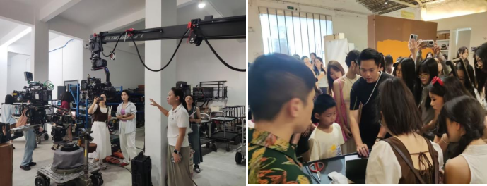 学生在深圳(来画)前海手绘科技文化有限公司参观,公司为学生展示影视摄像器材如何操作与使用