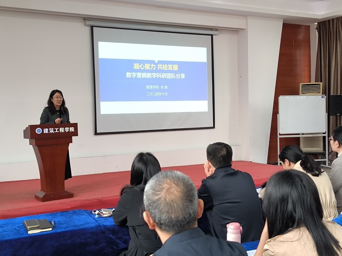 余敏老师以“团队建设”为主题,详细介绍了她所带领的数字营销教学科研团队的建设与发展历程。通过优秀基层教学组织申报和教学创新大赛两个案例,余敏老师展示了团队的成长突破,并就人才培养与使用及团队未来的发展分享了自己的思考。她的分享不仅为学院老师们树立了学习的榜样,也为老师们提供了交流优秀思路和先进方法的平台,让在场的老师们感到收获颇丰。