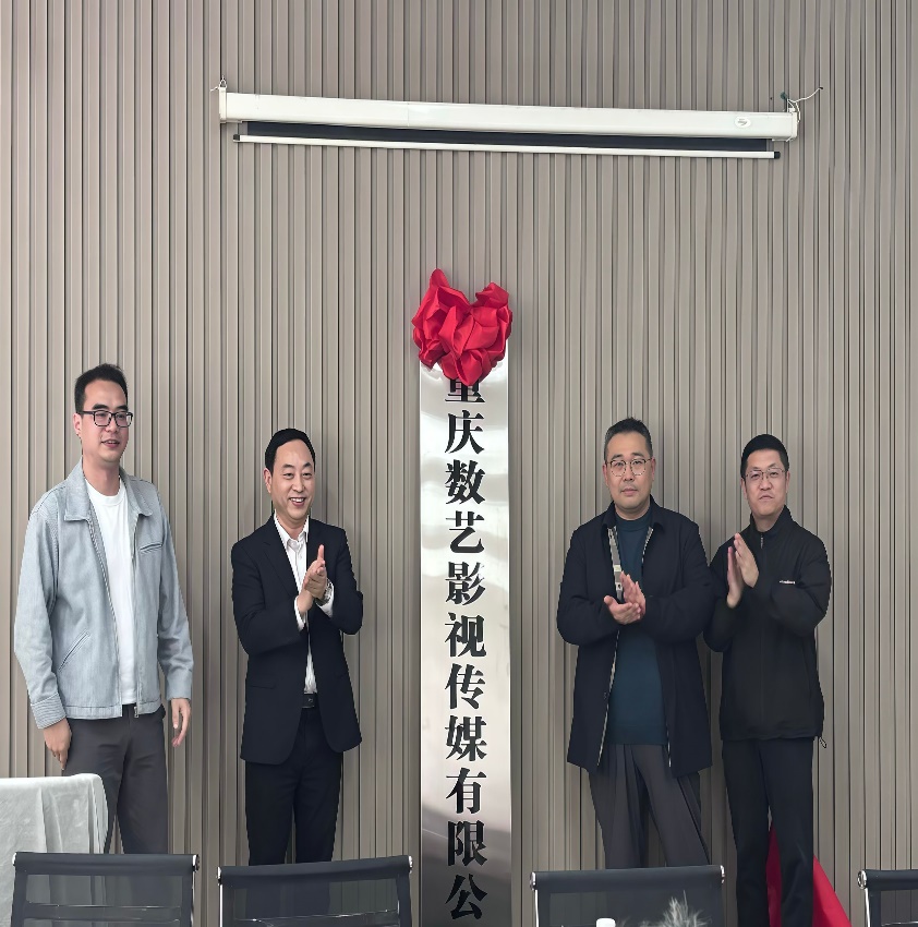 在随后进行的授揭牌意仪式中,张业平总经理为公司文化IP作品创作中心授牌并与顾问杨飞、副总经理庄涛文、杨林林一道为新公司揭牌。随着红绸落下,重庆数艺影视传媒有限公司正式启航。