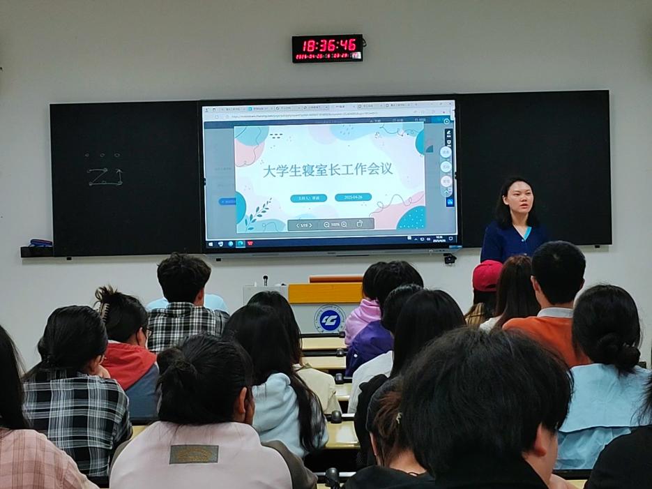 会议伊始,辅导员老师对各位寝室长在日常宿舍管理中发挥的积极作用表示肯定,强调寝室长作为连接学校与同学之间的重要桥梁,责任重大。紧接着,围绕着学生住宿管理规定、宿舍检查问题、作息时间、学生寝室考评方法四个方面展开了详细讲解。在学生住宿规定方面强调了遵守学校作息制度,再次强调了晚归、未归等时间节点;根据之前的查寝情况强调了各个寝室卫生问题,倡导各个寝室严格执行值日生制度,保持宿舍干净整洁,特别强调了严禁出现存放和使用违禁电器、私拉乱接等危害安全的行为;同时在文明建设上,鼓励寝室长带头营造积极向上、互帮互助的寝室氛围,杜绝不文明现象。会议最后,辅导员老师希望各位寝室长以此培训为契机,切实履行工作职责,配合好学校、学院的管理工作,及时反馈同学们的意见和建议,共同打造安全有序、舒适温馨的宿舍家园。