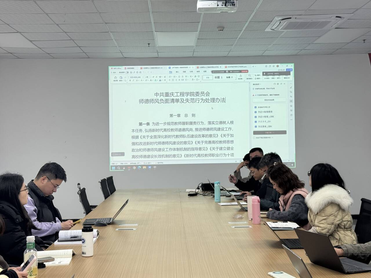 会议伊始,杨军副书记带领全体教职工认真学习了《重庆工程学院师德师风负面清单及失范行为处理办法》的重点内容,围绕“思想政治和意识形态类”“教书育人类”“学术道德类”“廉洁从业类”“个人作风类”等五大方面的负面清单进行了详细解读。通过逐条学习,大家对师德失范行为的具体表现及其后果有了更加清晰的认识,进一步明确了职业行为的底线和红线。