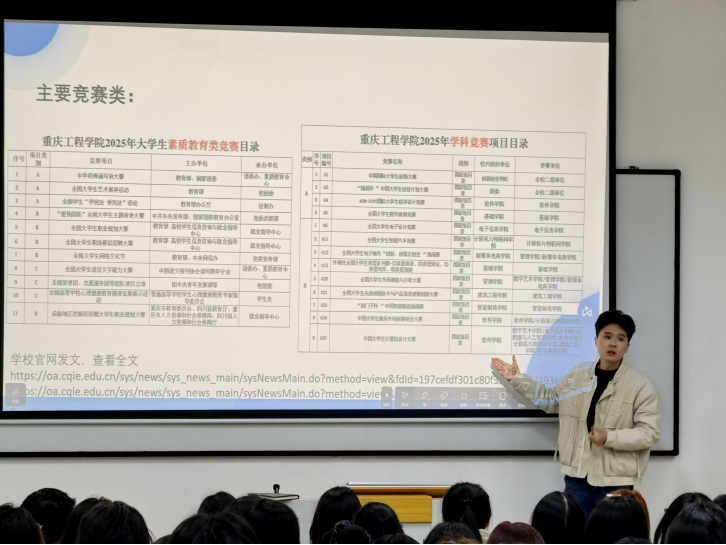 陆万里老师从竞赛概述、信息获取、赛事分类、参赛难度等核心维度展开讲解,重点介绍了学校素质教育类与学科竞赛两大体系赛事目录,详细梳理了中国大学生计算机设计大赛、华为ICT大赛、泰迪杯数据挖掘挑战赛等适合本院学生的重点赛事报名与参赛时间轴。同时,老师对竞赛奖励政策、创新创业实践学分认定标准进行细致解读,明确了A、B、C、D类竞赛的奖金梯度与学分分值,让同学们清晰知晓参赛的实际收获。